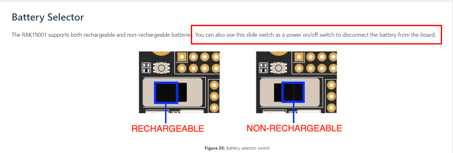 However, we have one model that has a switch selector for battery type. That is the RAK19001 Dual IO Baseboard. You can use this switch as an ON/OFF switch.