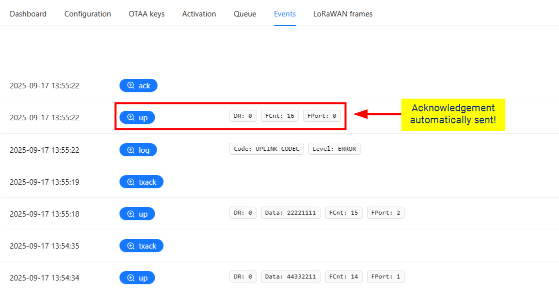 How come another downlink (whether confirmed or not) causes LNS to receive an ACK for the previous confirmed downlink? I don’t observe any Uplink within the “Events” or “LoRaWAN Frames” tabs in Chirpstack