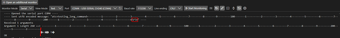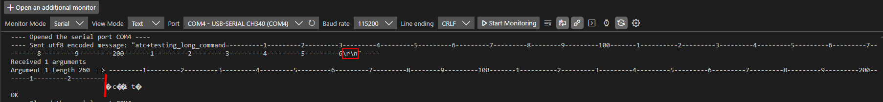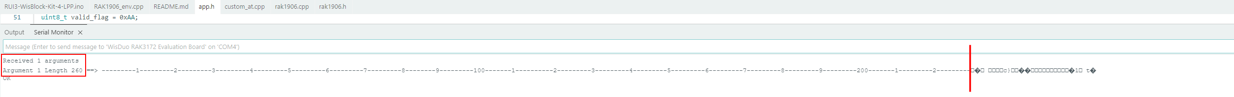 I tested multiple serial terminals and the parameter after the command itself is cut off at 230 characters, but the parameter length is reported as 260 bytes (that could be a bug in RUI3)