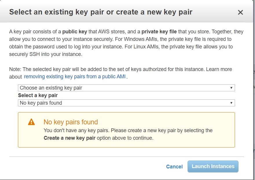 Choose “Create a new key pair” from the drop-down menu and give the keys an appropriate name. Download the key pair after and launch.