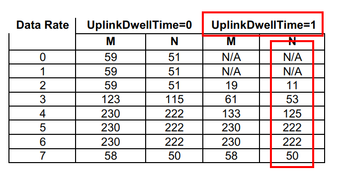 DR2: SF10BW125 → MTU (N): 11 bytes empirically validated