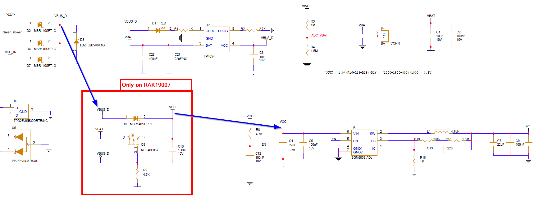 RAK19007 has a circuit that puts 5V from USB directly to the voltage regulator.