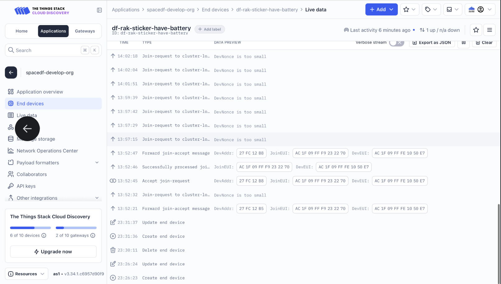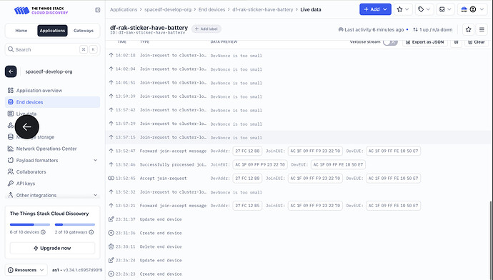 To use it, you can try to enable automatic reset of join nonces. Click on Reset used DevNonces as well. You can find this in the device setting under join setting.