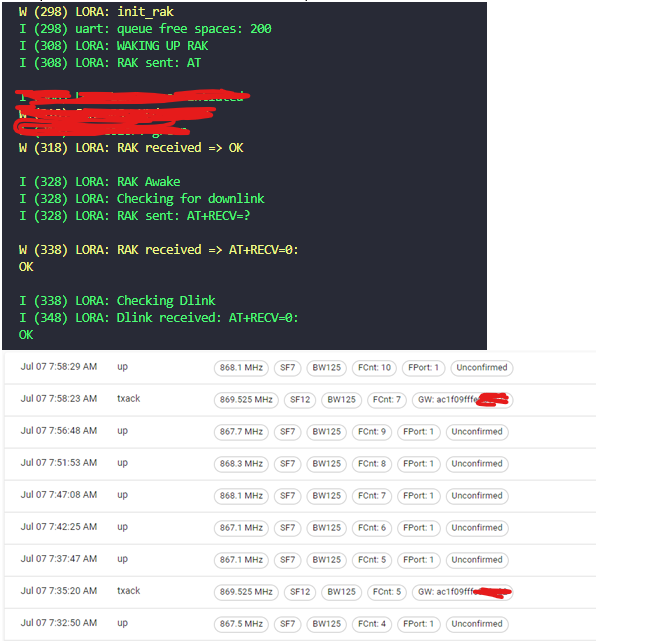 before I prepare the data I wake up the RAK3172 and check for any RECV from the previous cycle, even tought I can see in CS that downlinks are been sent, I always get RECV:0