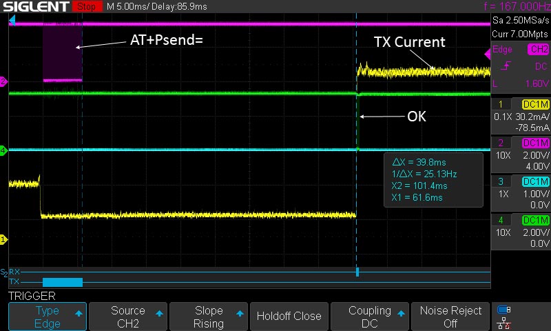Looks like when CAD detects a carrier it reports AT_BUSY_ERROR. Is this correct? That’s what I’m seeing on the scope. At the 32ms mark where OK appears in CAD mode I get an AT_BUSY_ERROR. That means you need to send out another PSEND. This is not good.