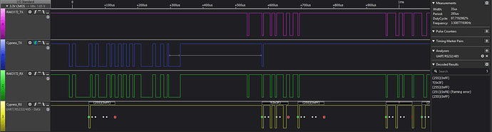 I cannot help you much on the code. But on the logic analayzer, it is strange that you see both ok on TX and RX line of RAK3172. Also the RX on Cypress side has missing pulses. It might be a good idea to get a oscilloscope and check the signal levels. If there is skewing issues, you can try to lower the baud rate or use lower resistance on your voltage divider.