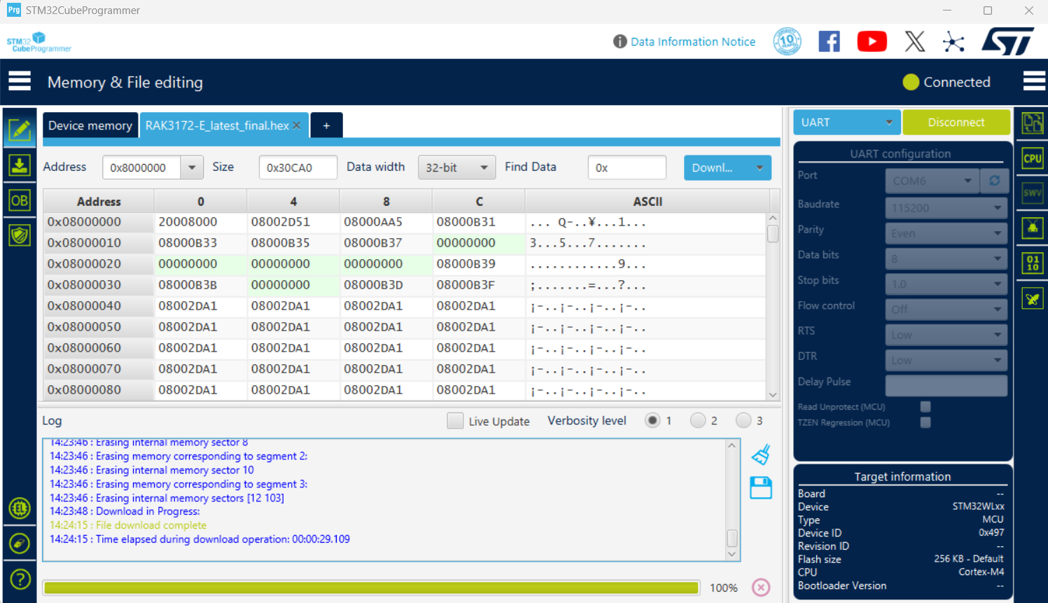 Try to flash the factory firmware RAK3172-E_latest_final.hex with STM32CubeProgrammer, as shown in How to Guide: STM32CubeProgrammer for RAK Modules
