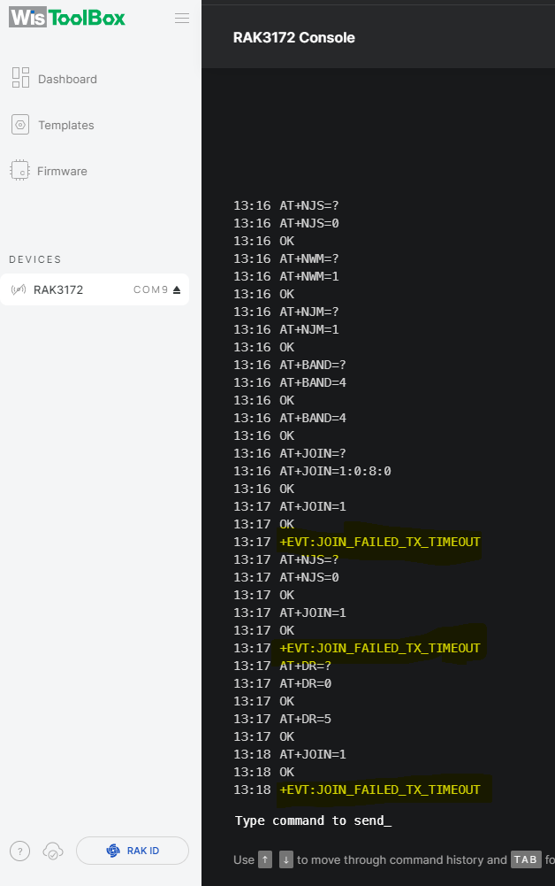 infact correct me if i am wrong. i used the Wis ToolBox and triggered the following AT commands on a bareminim RAK3172 chip but it is still not joining. i believed using the below AT commands that should connect to the network right? (without arduino ide)