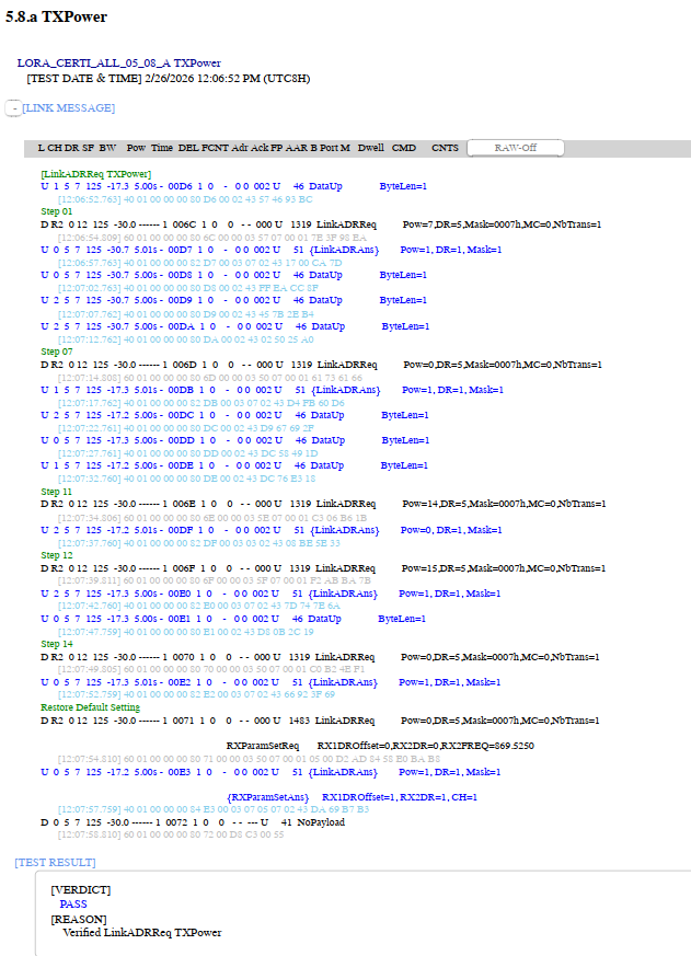 I am doing a pre certification test for our end device which is using the RAK3172 as an AT-LoRaWAN modem. And all the tests are passing and it is getting stuck on test 5.8.a which is for Change in TXPower for the module. Although the commands are being received the power seems to not be changing, and have even took the module approx 100meters away from the receiver, but alas nothing changed.
