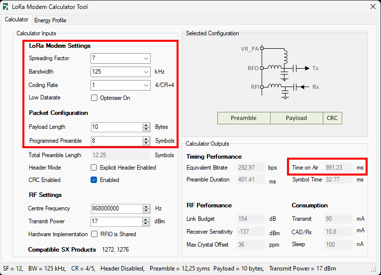 Your P2P settings and the payload length results in a “time on air” of nearly 1 second.