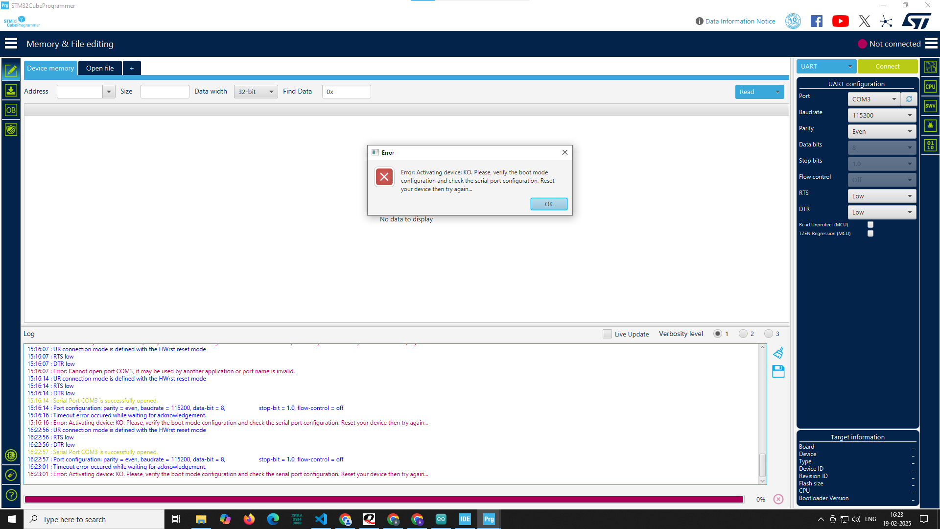 16:23:01 : Error: Activating device: KO. Please, verify the boot mode configuration and check the serial port configuration. Reset your device then try again…