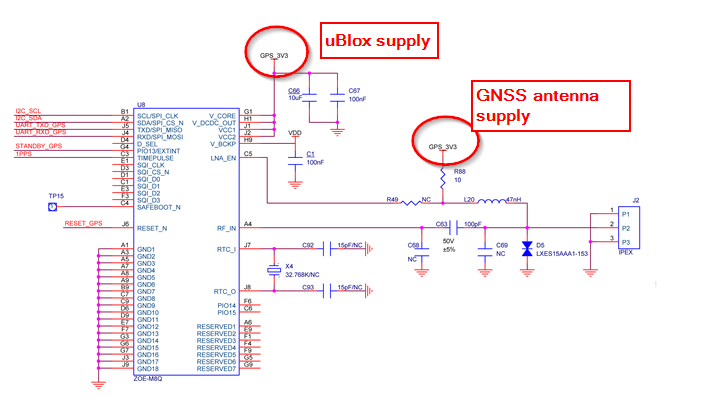 On page 9 of the protocol spec it says that you need to explicitly save the configuration from the working image to the non-volatile memory (in our case the battery backed RAM powered from the fixed 3V3). This is done with the UBX-CFG-CFG message. I set the mask to 0x1F to save everything in my configuration. Specifically, this keeps the NMEA strings off the UART lines and there are no stray messages during wakeup. This is good, because it means that I don’t have to remove the R56 and R58 resistors to isolate the UART.