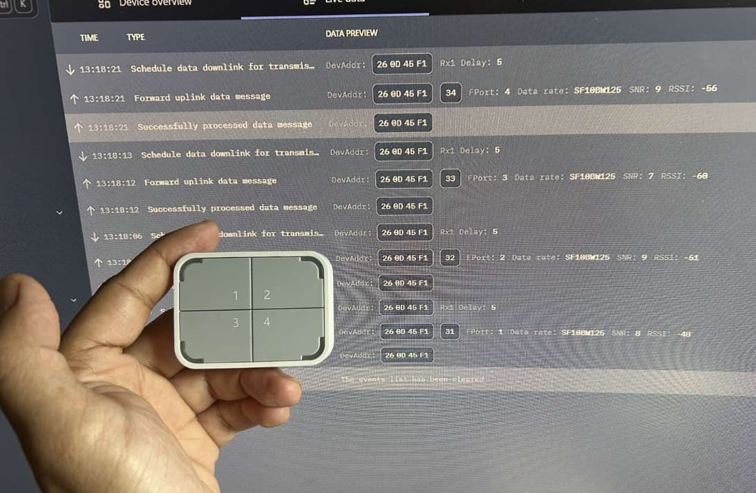 The device’s serial output correctly identifies which physical button was pressed (BUTTON_1_PIN, BUTTON_2_PIN, etc.) and reports +EVT:SEND_CONFIRMED_OK for each press. The button interrupt and local detection are working correctly.