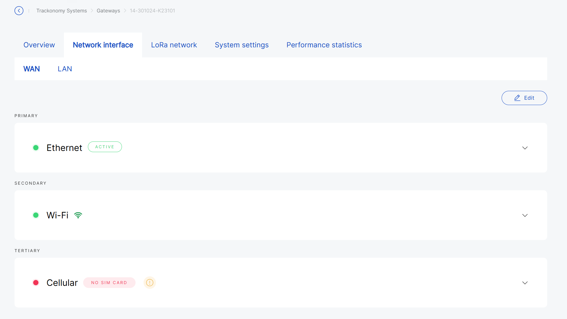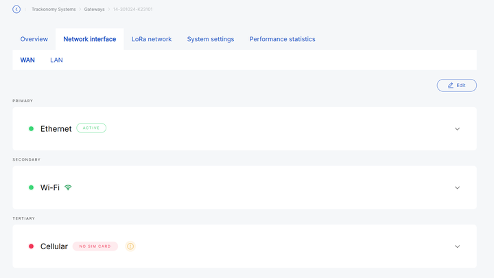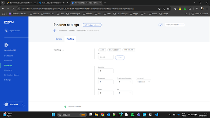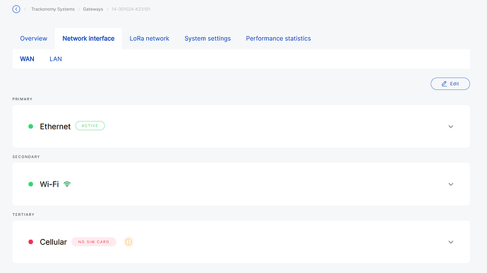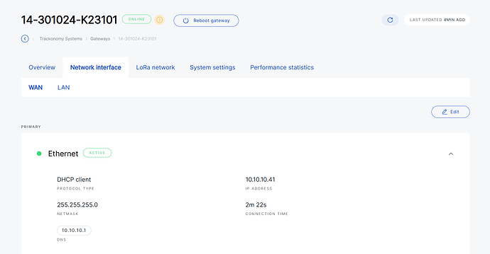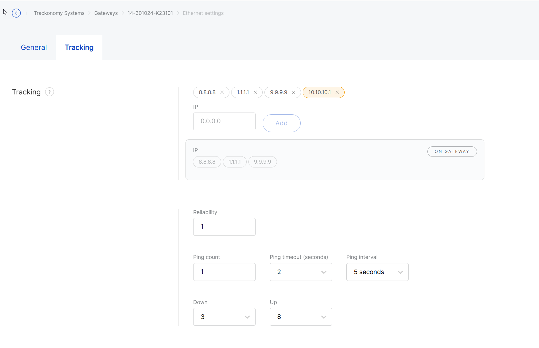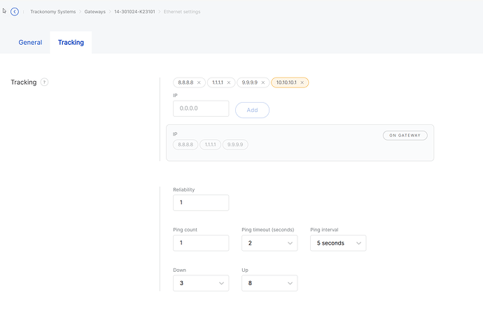 Below you can see my gateway (RAK7289CV2) configuration. Could you get the your Gateway ethernet port Tracking configuration?