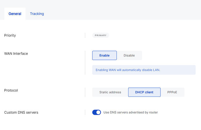 Hi Claudio, I have attached the WAN Ethernet setting and the Tracking. IMO, the fact that the DHCP client in the 7268 has not accepted the DHCP offer and bound the ethernet port to that IP address is why the Ethernet port is inactive.
