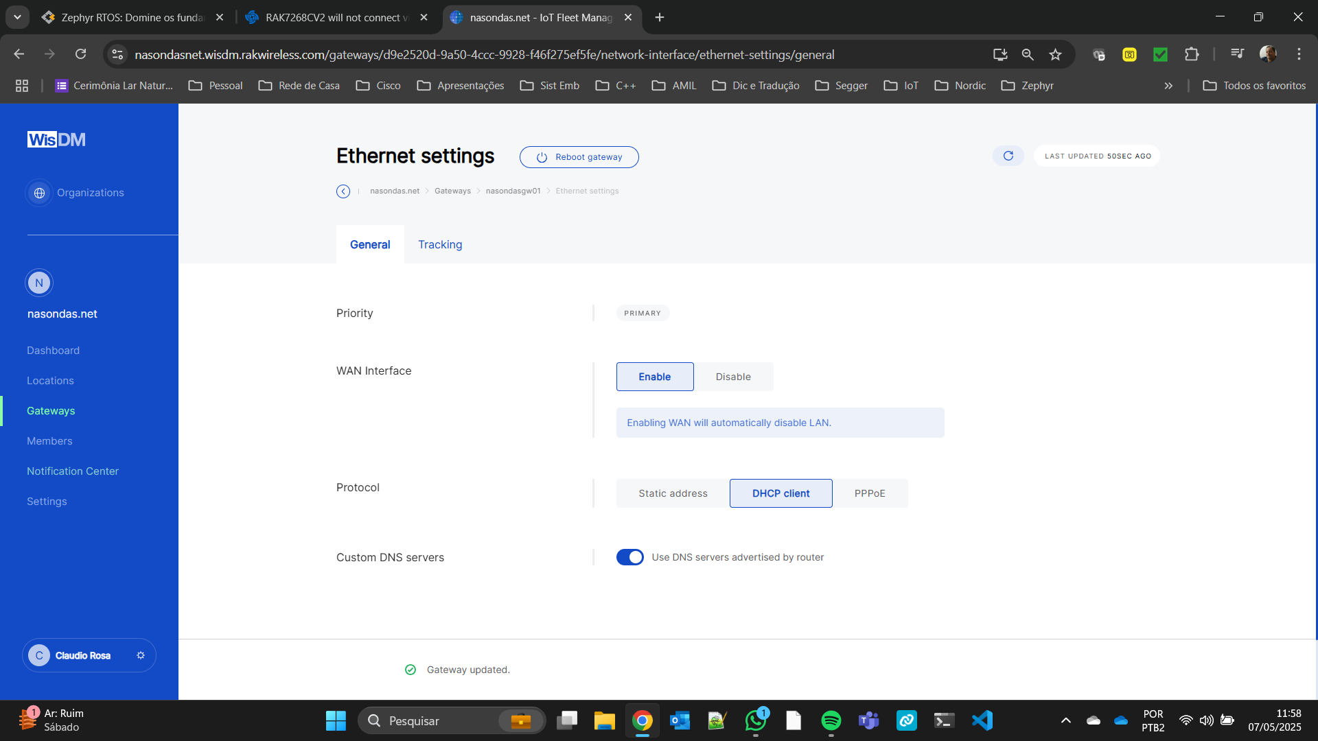 The RAK utilities are buggy, especially when you change Ethernet between WAN/LAN. I found a recent issue where changing from a Static WAN Ethernet IP to a DHCP served LAN Ethernet was not fully clearing all the settings. There were also stale routes for the static IP
