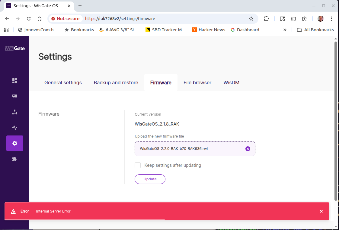 I tried several things, and the update was more successful when I accessed the web UI using a static IP address connected via ethernet than when I connected to the gateway’s AP interface, 192.168.230.1.