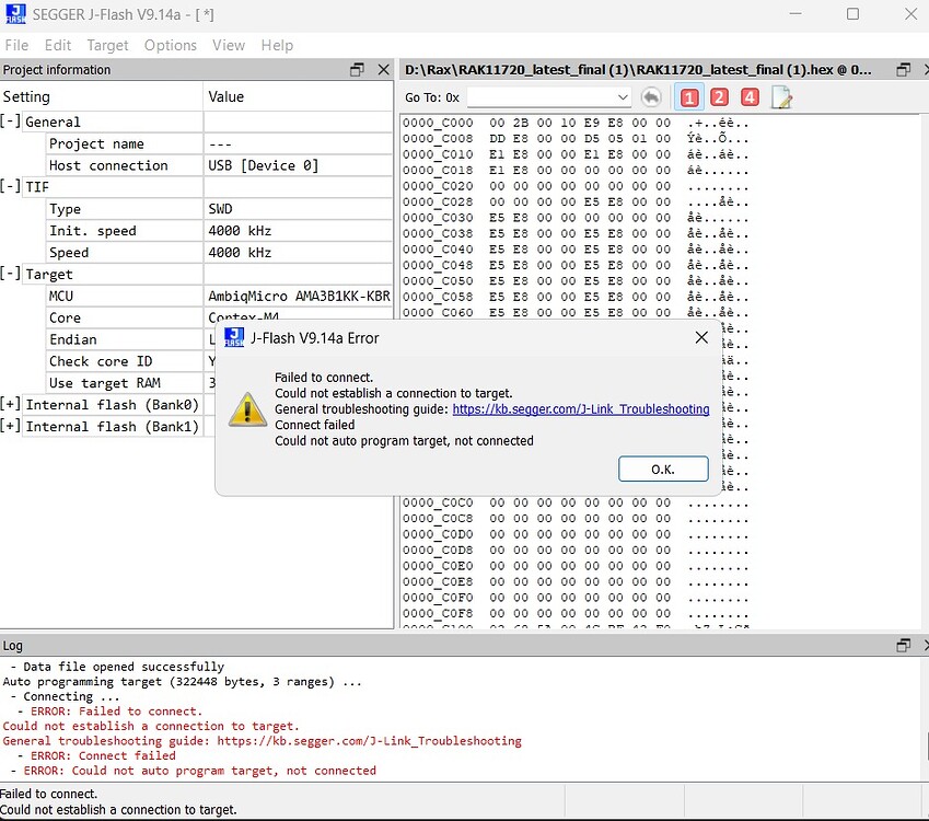 We are currently working with RAK11720 and RAK3172 LoRa modules in our project. During development, we encountered firmware-related issues where the modules are no longer responding correctly (AT mode and custom firmware upload are not functioning as expected).The error message is attached below.