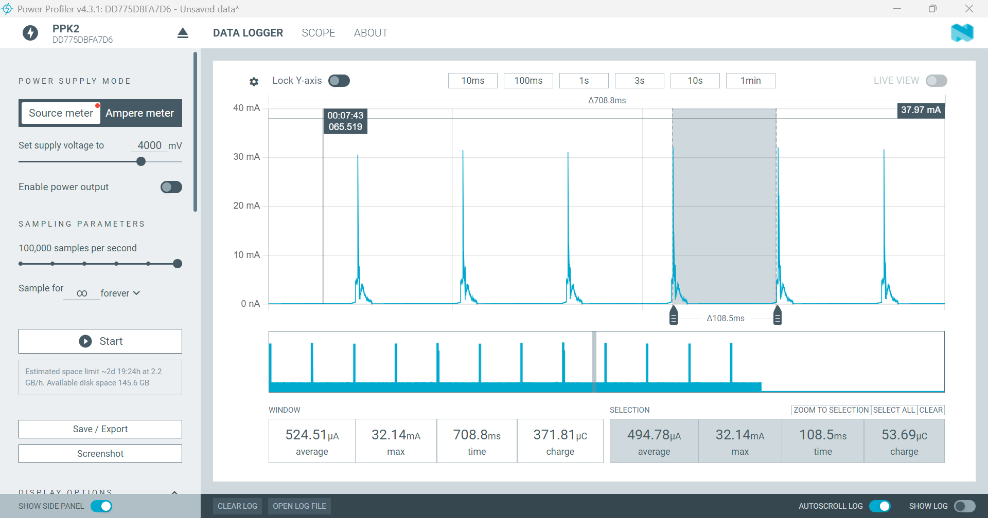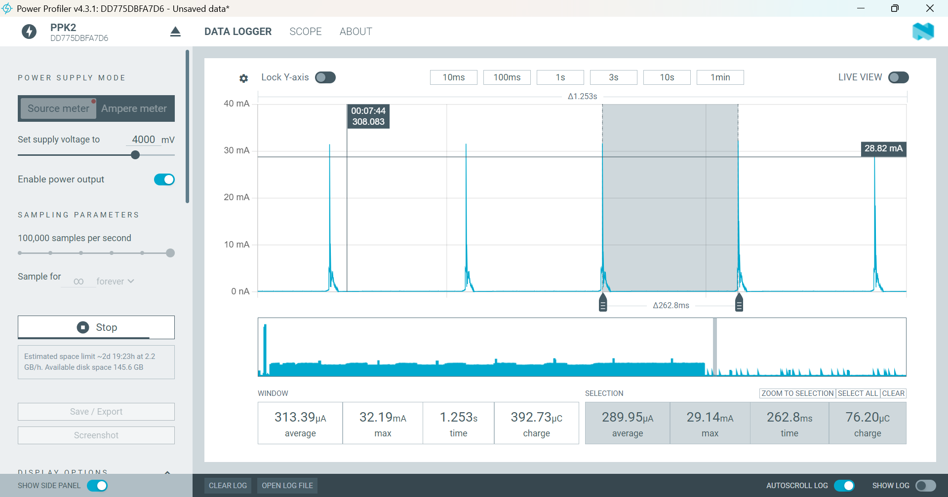 From this values, the following results were obtained by using PPK2 from Nordic, where the time interval for rx_time and sleep_time seem to correspond to the calculated values …