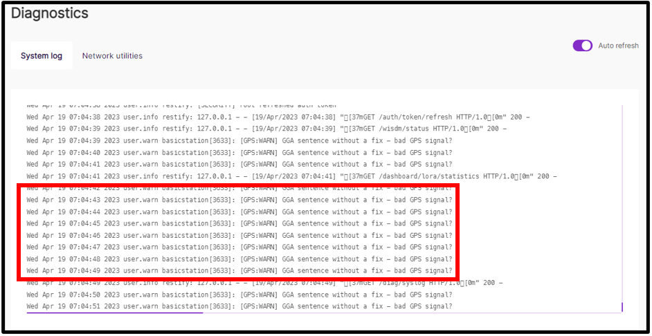 Tue Apr 18 10:20:07 2023 user.warn basicstation[12347]: [GPS:WARN] GGA sentence without a fix - bad GPS signal?